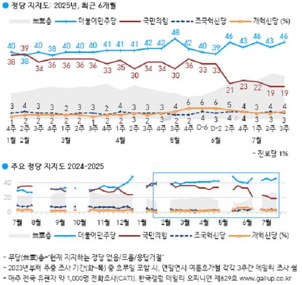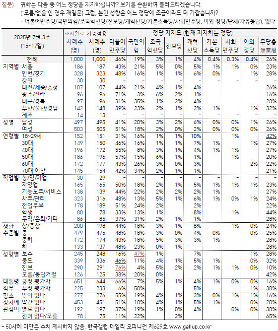 18ÀÏ ¿©·ÐÁ¶»ç Àü¹®±â°ü Çѱ¹°¶·´Àº ¡°Çѱ¹°¶·´ÀÌ 2025³â 7¿ù ¼Â° ÁÖ(15~17ÀÏ) Àü±¹ ¸¸ 18¼¼ ÀÌ»ó À¯±ÇÀÚ 1,000¸í¿¡°Ô ÇöÀç ÁöÁöÇÏ´Â Á¤´çÀº ¾îµðÀÎÁö(´ç¸í ·ÎÅ×À̼Ç, ÀçÁú¹® 1ȸ)¹°Àº °á°ú ´õºÒ¾î¹ÎÁÖ´ç 46%, ±¹¹ÎÀÇÈû 19%, °³Çõ½Å´ç 4%, Á¶±¹Çõ½Å´ç 3%, Áøº¸´ç 1%, ÁöÁöÇÏ´Â Á¤´ç ¾ø´Â ¹«´ç(ÙíÓÚ)Ãþ 26%·Î ³ªÅ¸³µ´Ù¡±°í ¹ßÇ¥Çß´Ù.
