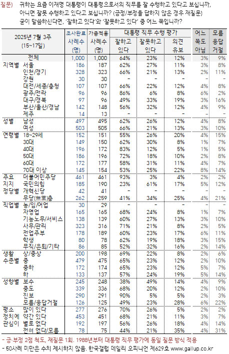 18ÀÏ ¿©·ÐÁ¶»ç Àü¹®±â°ü Çѱ¹°¶·´Àº ¡°Çѱ¹°¶·´ÀÌ 2025³â 7¿ù ¼Â° ÁÖ(15~17ÀÏ) Àü±¹ ¸¸ 18¼¼ ÀÌ»ó À¯±ÇÀÚ 1,000¸í¿¡°Ô ÀÌÀç¸í ´ëÅë·ÉÀÌ ÇöÀç ´ëÅë·ÉÀ¸·Î¼ÀÇ Á÷¹«¸¦ Àß ¼öÇàÇϰí ÀÖ´Ù°í º¸´ÂÁö À߸ø ¼öÇàÇϰí ÀÖ´Ù°í º¸´ÂÁö ¹°Àº °á°ú(2Á¡ ôµµ, ÀçÁú¹® 1ȸ), 64%°¡ ±àÁ¤ Æò°¡Çß°í 23%´Â ºÎÁ¤ Æò°¡Çß´Ù(12%´Â ÀÇ°ß À¯º¸)¡±°í ¹ßÇ¥Çß´Ù.