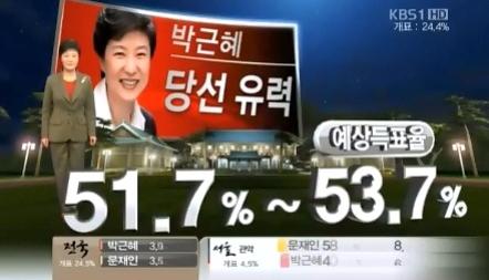KBS 1TV´Â ¼¿ï ÅõÇ¥ÀÚ ¼ö 8,393,847¸í Áß ºÒ°ú °³Ç¥À² 6.4%ÀÎ 536,318¸í °³Ç¥Çϰí ÀÖÀ» ¶§ ¹Ú±ÙÇý ´ç¼± À¯·ÂÀ» ¹ßÇ¥Çß´Ù. À̶§ Àüü °³Ç¥À² 24.4%, ¼¿ï °³Ç¥À² 6.4%¿´´Ù. ±×·³¿¡µµ KBS 1TV°¡ ´ç¼± À±°ûÀÌ ³ª¿Ô´Ù°í Çß´Ù. ÀÌ´Â ÀÖÀ» ¼ö ¾ø´Â ÀÏÀÌ´Ù.