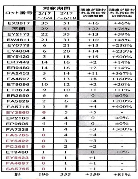 ÀϺ» Áúº´°ü¸®Ã»ÀÇ ÀڷḦ ÅëÇØ ¿¹¸¦ µé¸é ÈÀÌÀÚ ¹é½Å¿¡¼ »ç¸Á·üÀÌ °¡Àå ³ôÀº ·ÎÆ®(Lot) EX3617 ¹é½ÅÀÌ ÀÖ°í, °ÅÀÇ ¹°¹é½ÅÀ¸·Î ¾Ë·ÁÁø ¹«´õ±â(Lot) FA4697, EY 5423 ¹é½ÅÀÌ ÀÖ´Ù.