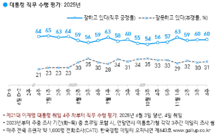 ÀÌÀç¸í ´ëÅë·É ÁöÁöÀ² 2ÁÖ ¿¬¼Ó 60%¡¦Á¤´çÁöÁöÀ², ¹ÎÁÖ 42%¡¤±¹Èû 24%