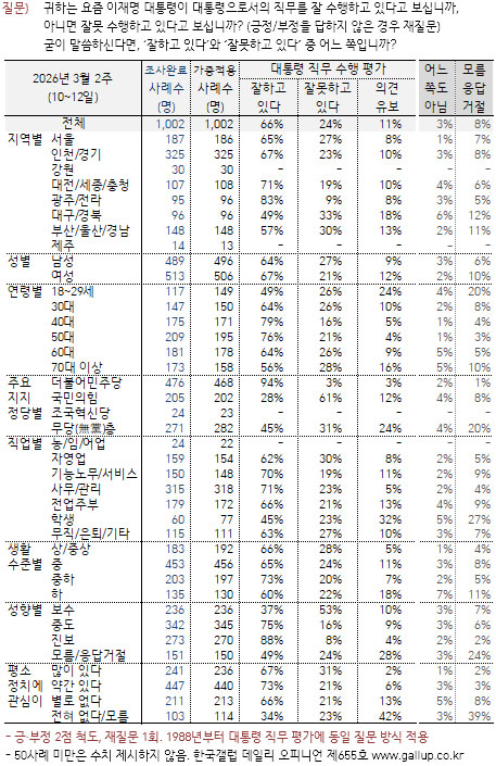 ¿©·ÐÁ¶»ç Àü¹®±â°ü Çѱ¹°¶·´Àº 12ÀÏ ¡°3¿ù 10~12ÀÏ Àü±¹ ¸¸ 18¼¼ ÀÌ»ó À¯±ÇÀÚ 1,002¸íÀ» ´ë»óÀ¸·Î ÀÚü Á¶»çÇÑ °á°ú, ÀÌ ´ëÅë·ÉÀÇ Á÷¹« ¼öÇà¿¡ ´ëÇØ 66%°¡ ¡®ÀßÇϰí ÀÖ´Ù¡¯, 24%°¡ ¡®À߸øÇϰí ÀÖ´Ù¡¯°í Æò°¡Çϰí 11%´Â ÀǰßÀ» À¯º¸Çß´Ù.¡±°í ¹ßÇ¥Çß´Ù.