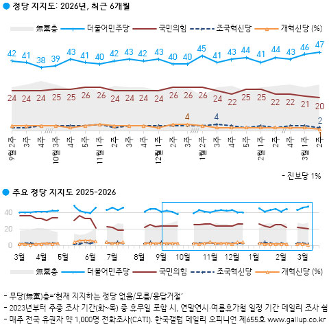 Á¤´ç ÁöÁöµµ, ¹ÎÁÖ´ç 47% vs ±¹¹ÎÀÇÈû 20%¡¦ÁöÁö °ÝÂ÷ È®´ë