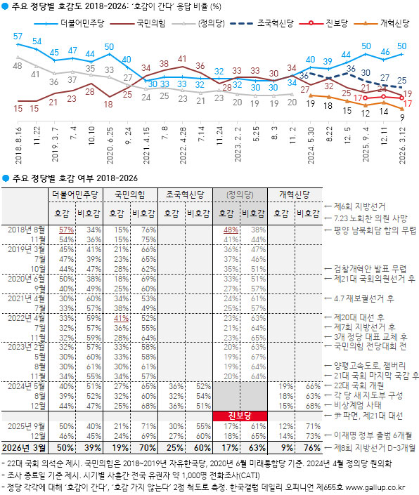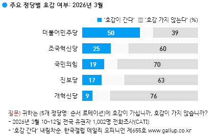 ÁöÁöÁ¤´ç°ú »ó°ü ¾øÀÌ ¾î´À Á¤´ç¿¡ È£°¨ÀÌ °¡´À³Ä¶ó´Â Á¤´ç È£°¨µµ¸¦ º¸¸é ´õºÒ¾î¹ÎÁÖ´ç: È£°¨ 50% / ºñÈ£°¨ 39%, ±¹¹ÎÀÇÈû: È£°¨ 19% / ºñÈ£°¨ 70%, Á¶±¹Çõ½Å´ç: 25% / 60%, Áøº¸´ç: 17% / 63%, °³Çõ½Å´ç: 9% / 76%µîÀ̾ú´Ù.